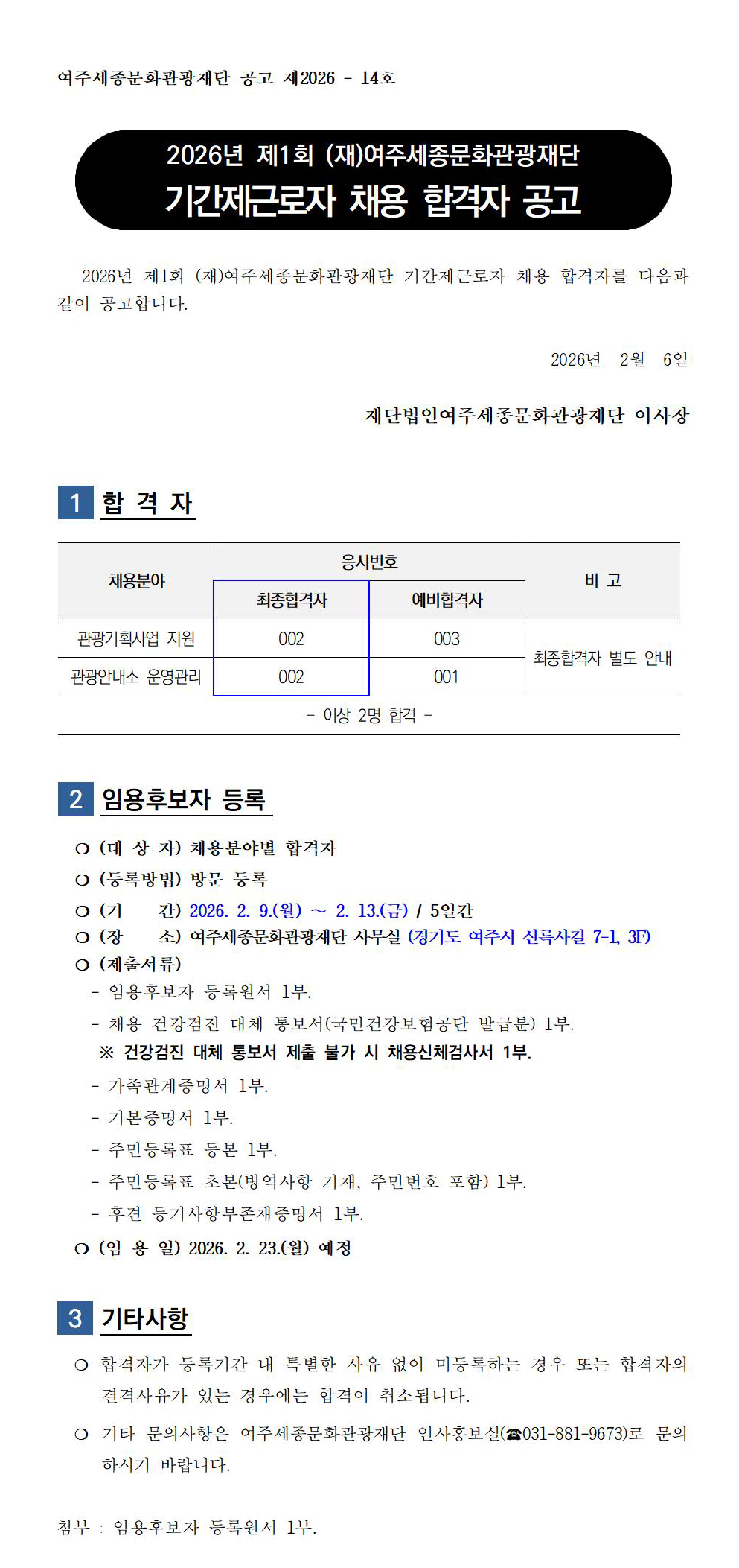 2026년 제1회 (재)여주세종문화관광재단 기간제근로자 채용 합격자 공고